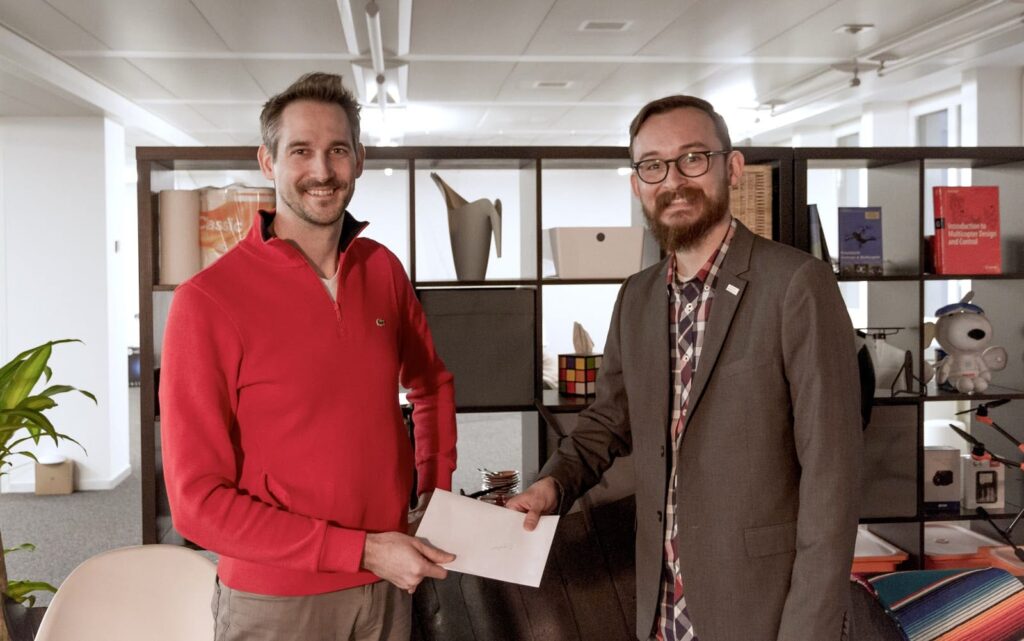 Kevin Sartori, Co-founder at Auterion hands over the Dronecode application to Ramon Roche, Programm Manager at Dronecode in the Auterion office in Zurich.