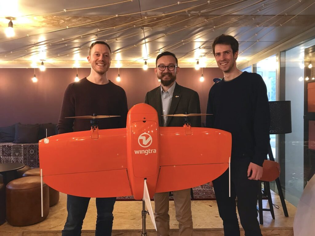 Armin Ambühl, CTO, Ramon Roche, and Maximilian Boosfel, COO and Co-founder with the WingtraOne Drone.