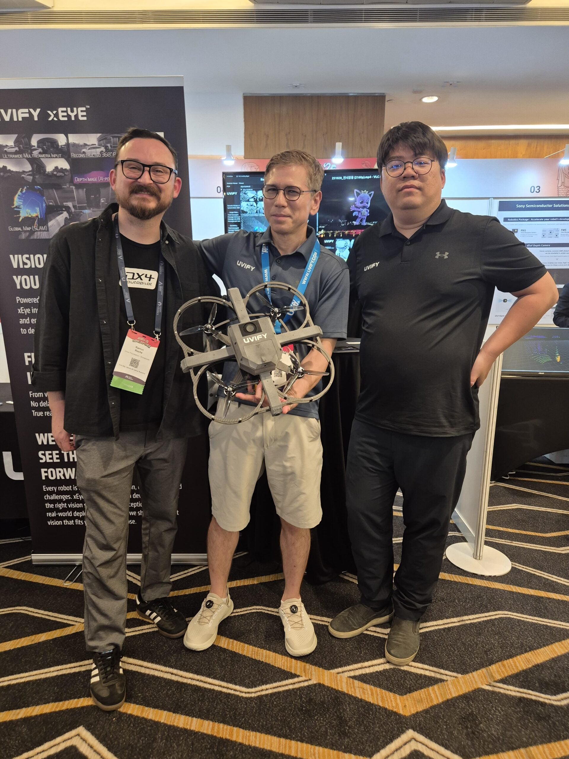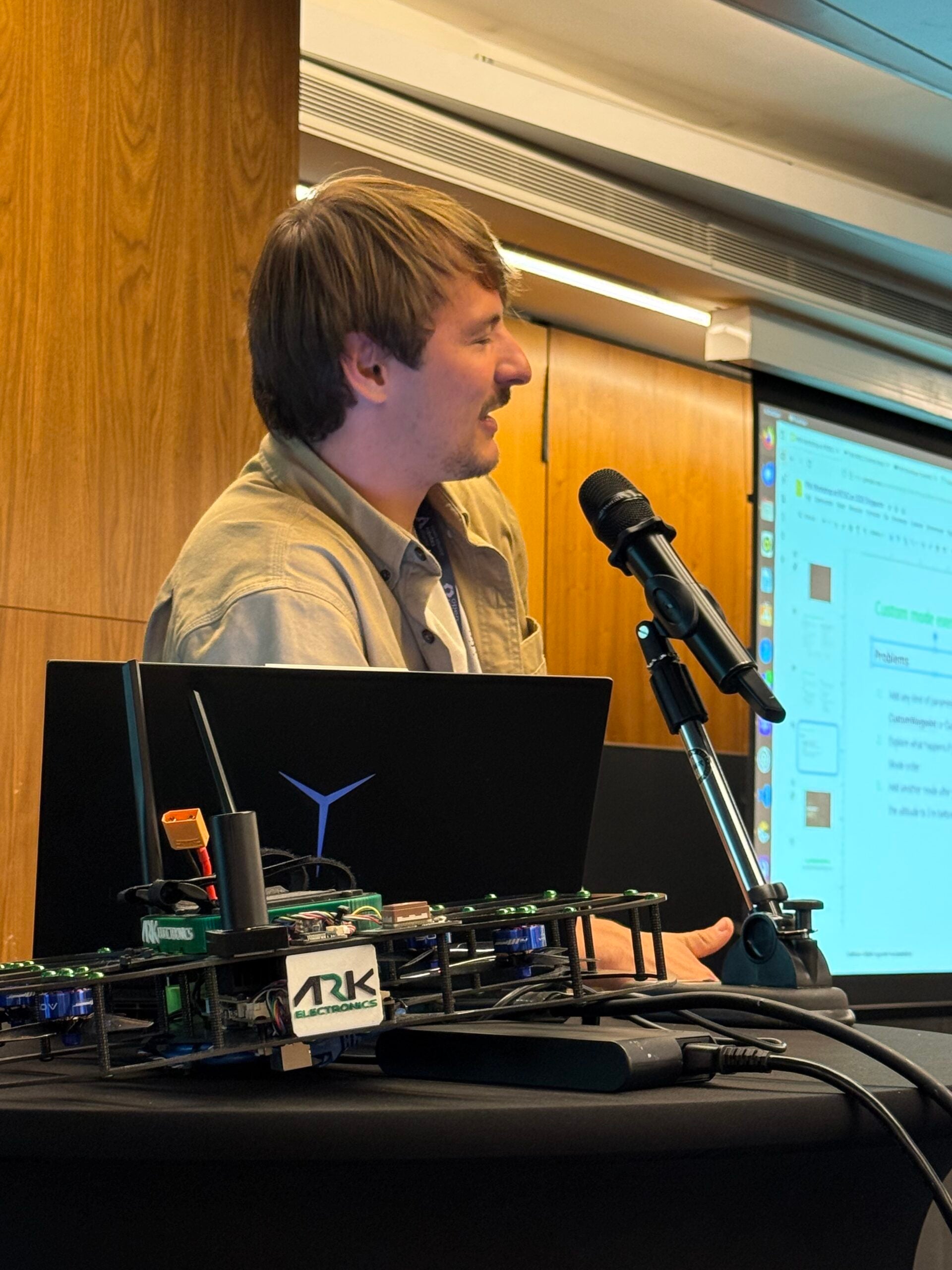 ROSCon’s sponsor showcase featured several exciting PX4-powered demos. Benji Barash from Roboto AI demonstrated PX4 integrated with their perception and autonomy stack. UVify presented their advanced Omega research platform, featuring the new Xeye visual odometry solution for ROS developers, with founder Hyon Lim and Robb Cheek leading the presentation. PX4 was also mentioned across multiple talks throughout the conference, underscoring its growing role in the broader ROS ecosystem.