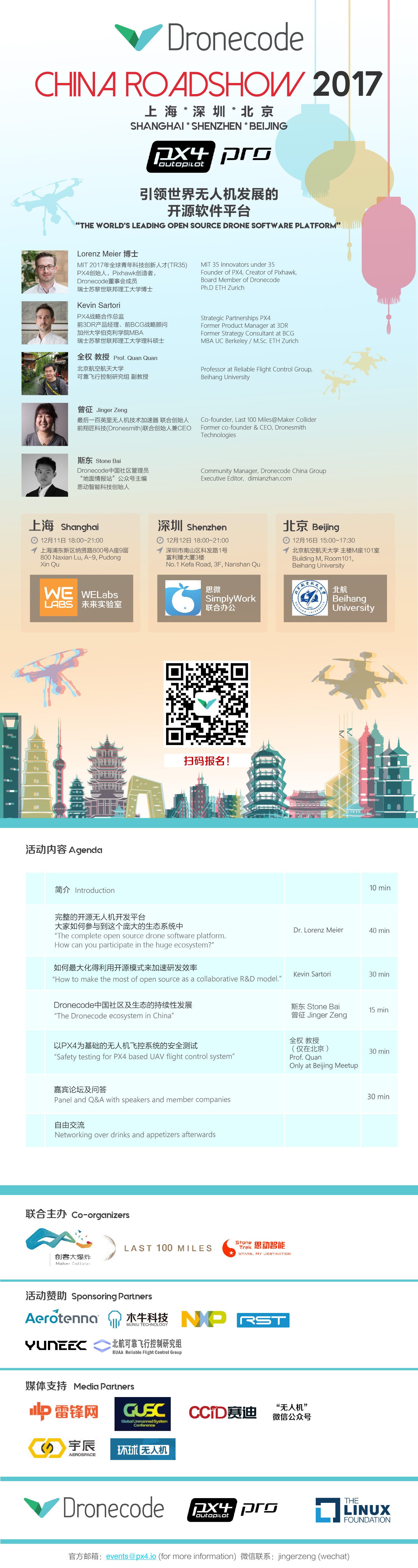The Chinese Dronecode ecosystem is growing at a blazing speed. To meet this demand and answer the community’s questions we are coming to China December 11th-16th for a series of meetups with our members and ecosystem partners.