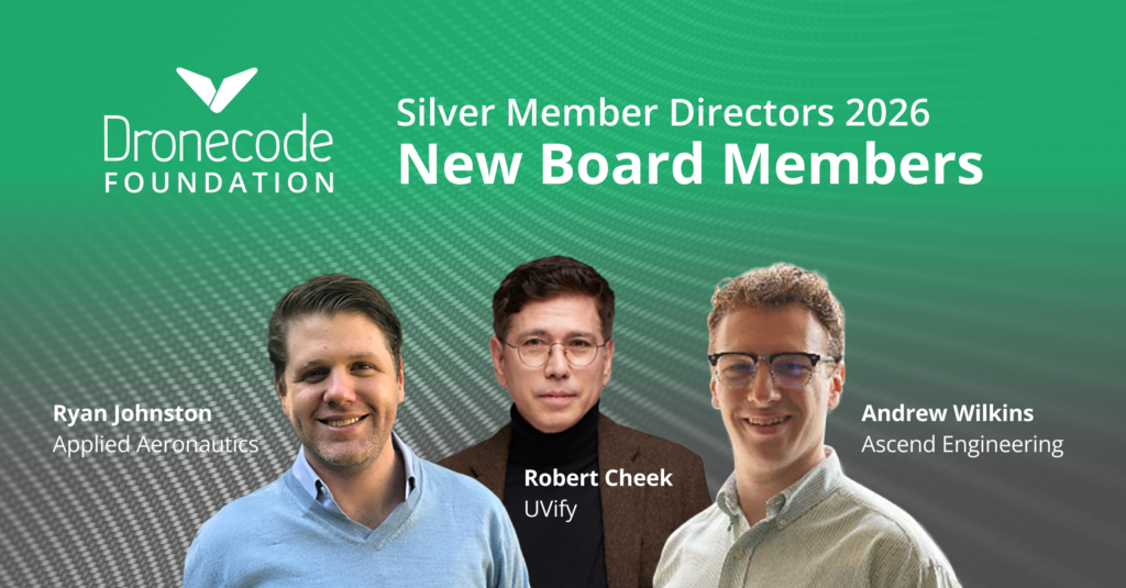 We are pleased to announce the newly elected Silver Member representatives to the Dronecode Board of Directors: Andrew Wilkins, Ryan Johnston, and Robert Cheek. The election was held over the past few weeks, and the new board members will begin their terms this month. This year’s election saw our most competitive race to date, with five outstanding candidates vying for three seats. We are grateful to all the nominees who put themselves forward and to our Silver Members for their participation in this important community process. The newly elected directors bring a wealth of experience in drone technology, open source development, and commercial operations that will help guide Dronecode into its next chapter.